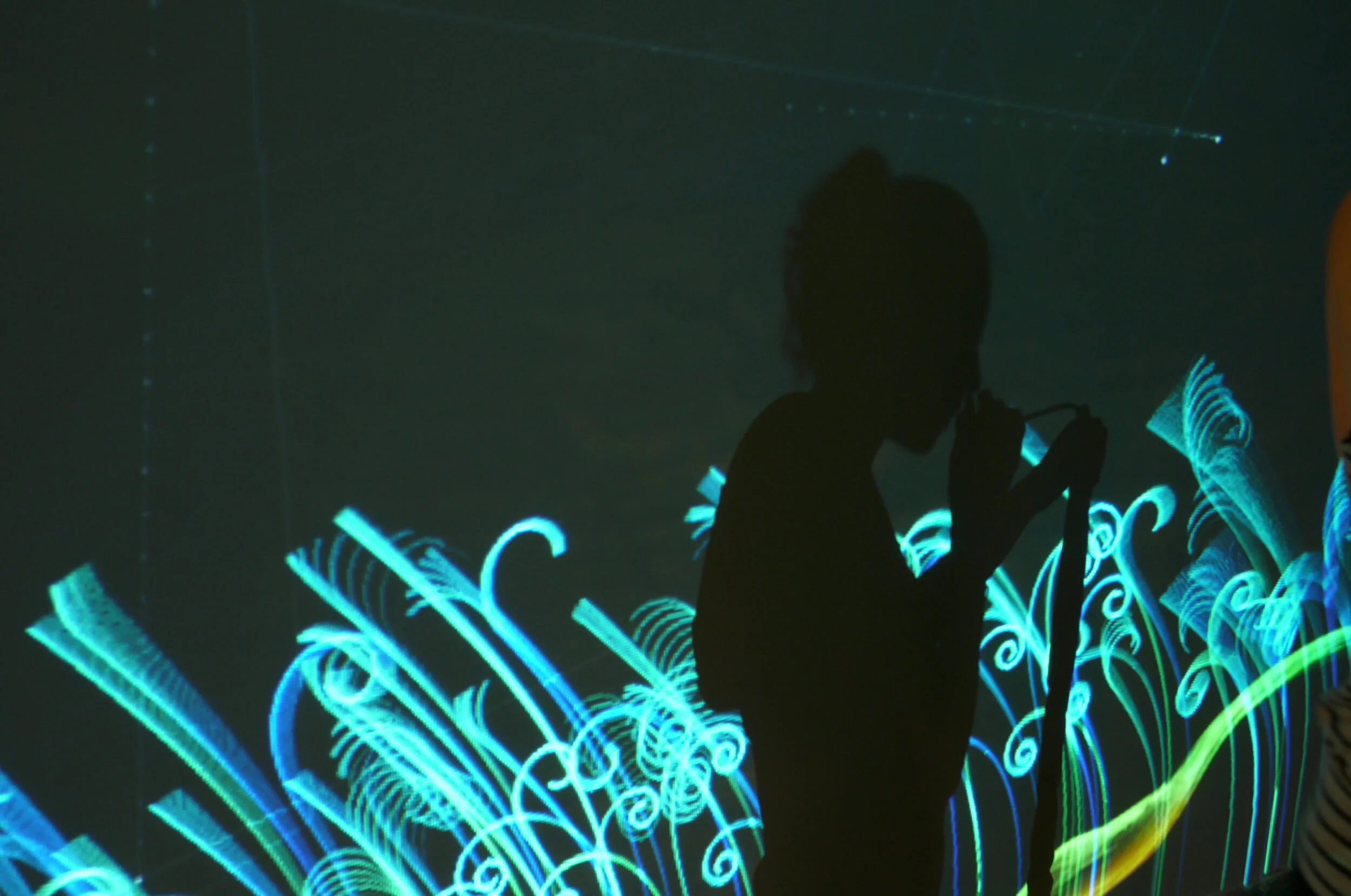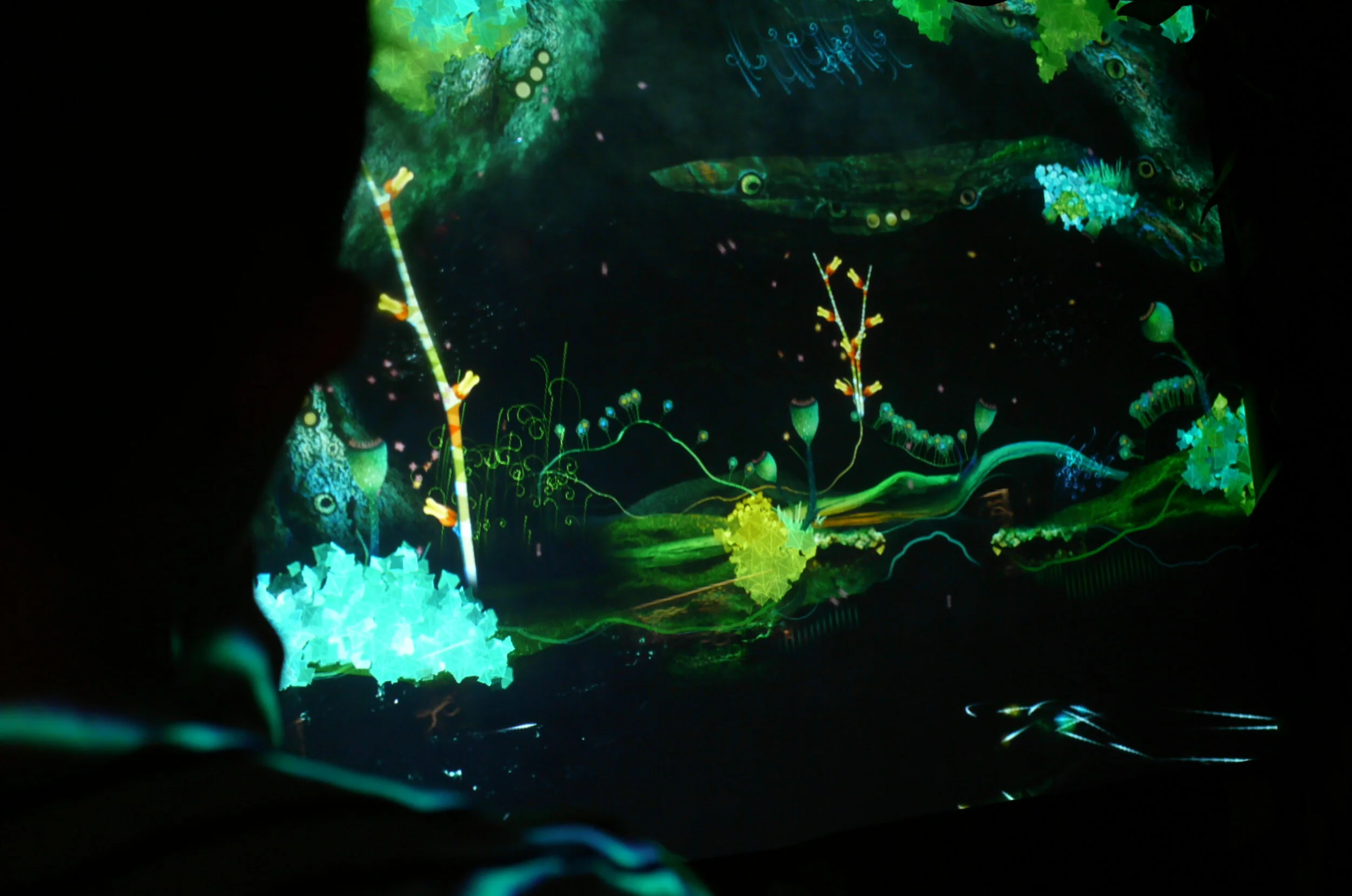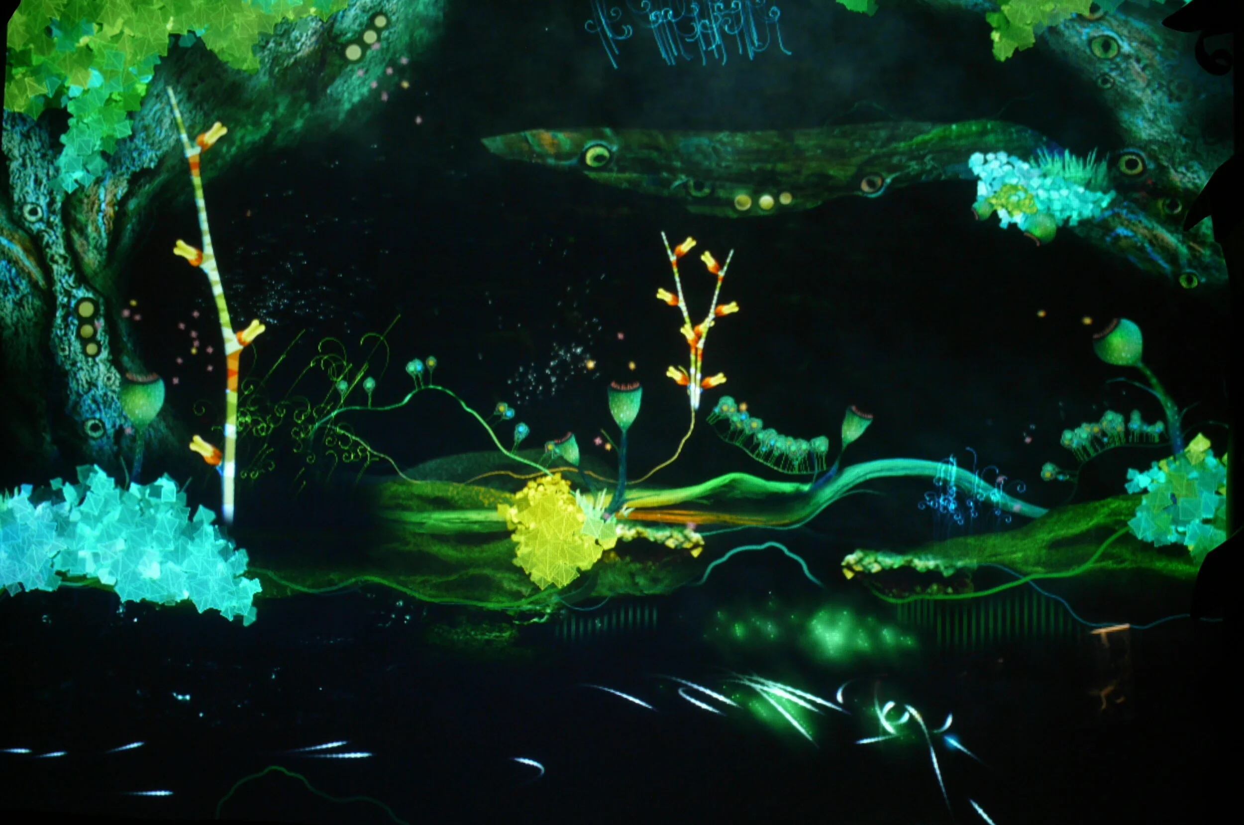 Terrarium is an interactive, sonic ecosystem whose source of energy comes from the sounds people make interacting with the work. The sounds of the participants voices come into the world via the sound vents. These sounds are too raw for the environment so they are sucked in by the Seed Spitters who process the sounds to more manageable particles which are then expelled into the environment. These processed sound particles help spawn and sustain life within the ecosystem, providing food for the fish in the water and creating frequency sensitive plants on the land. The voice also triggers changes to the Pattern Bush who adapts the shapes of its leaves to the sounds it hears.